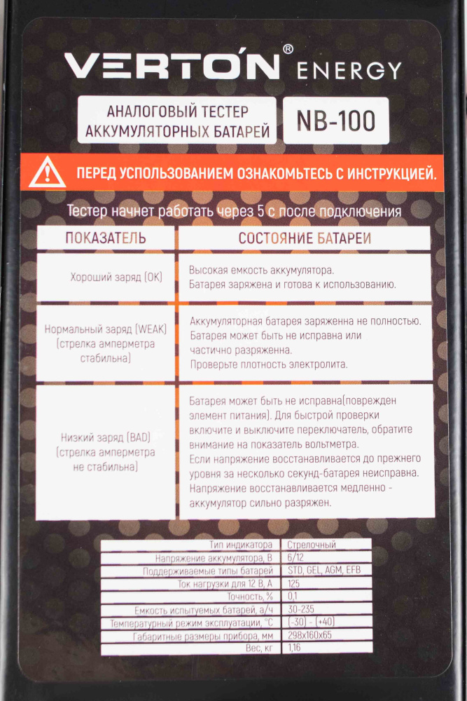 • Определяет степень заряда и исправности АКБ с номинальным напряжением 6/12 В.