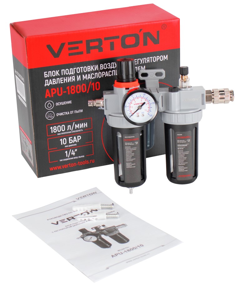Компактный и многофункциональный блок подготовки воздуха Verton Air APU1800/10 выполняет 3 ключевые функции, которые значительно продлевают срок службы пневматических инструментов и снижают риск дорогостоящих поломок.