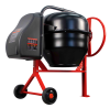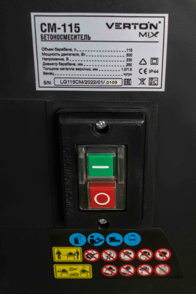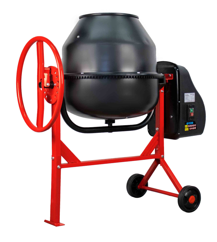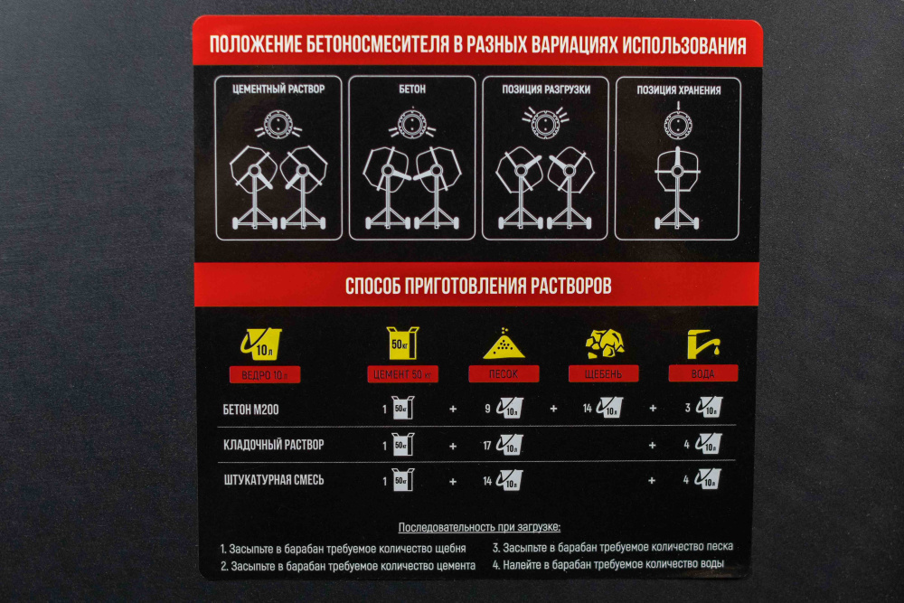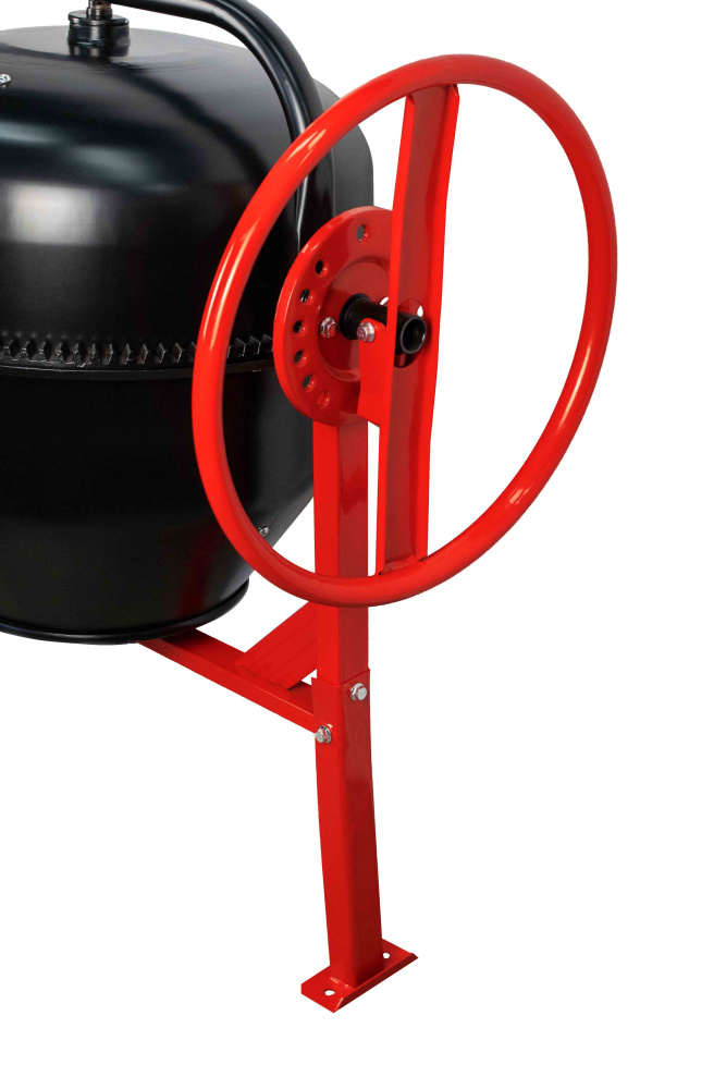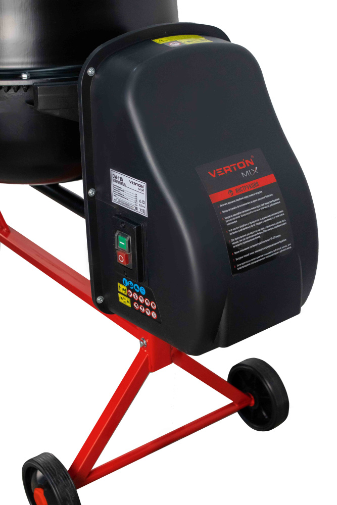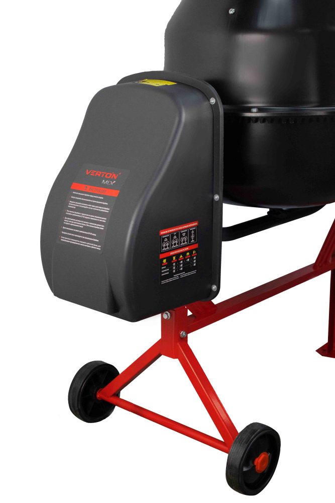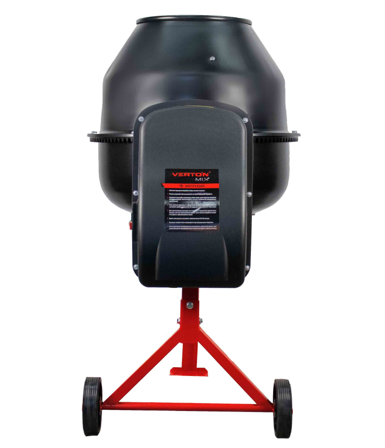 Траверса с закрепленным на ней барабаном фиксируется к опорной раме (через втулки и подшипники качения). С одной стороны рамы расположен механизм опрокидывания емкости с фиксатором для создания необходимого рабочего угла и возможности выгрузки готового раствора. С другой стороны прикреплен блок электродвигателя и рабочая шестерня.