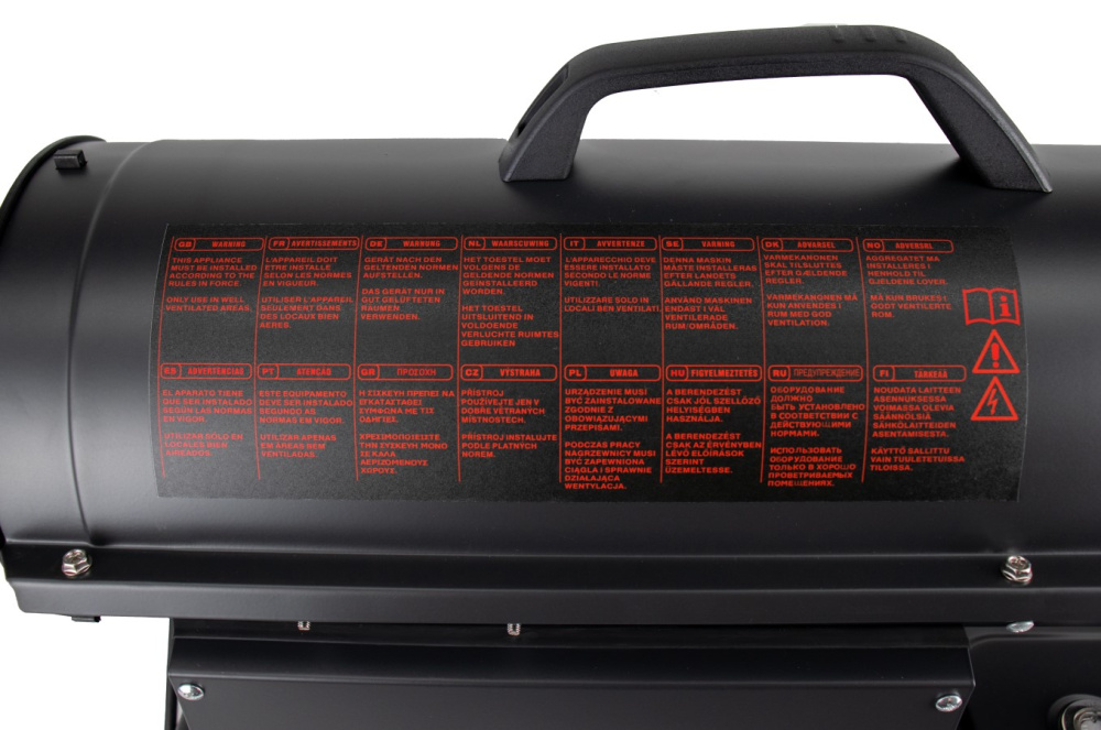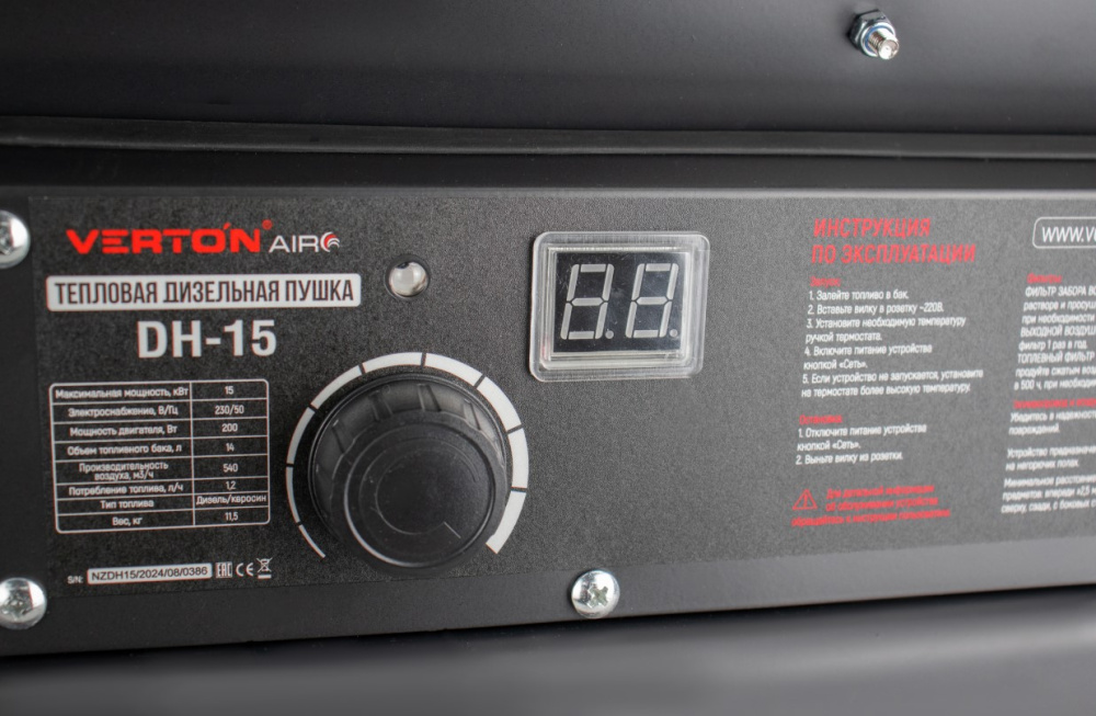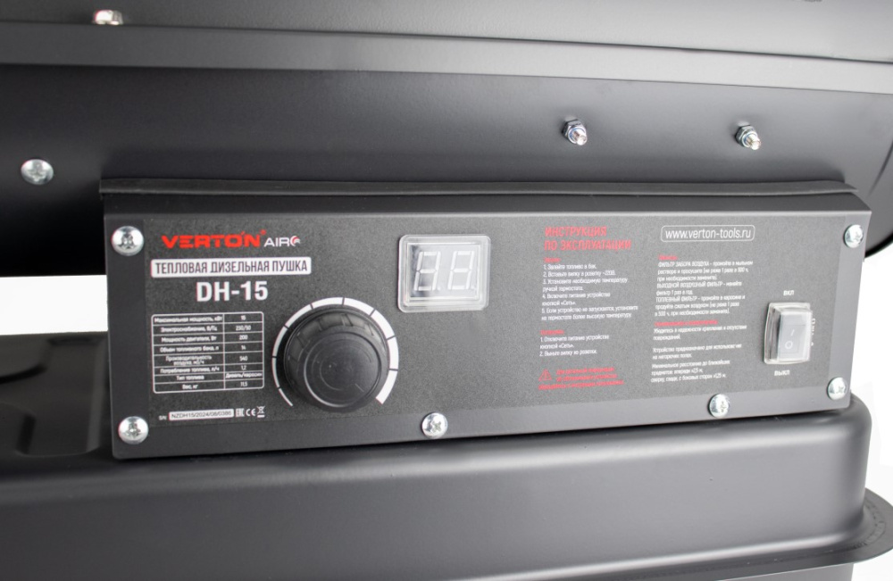 • Система управления оснащена термостатом, который позволяет поддерживать установленную температуру в обогреваемом помещении и цифровым дисплеем, адаптированным к работе при отрицательных температурах, что делает управление пушкой более простым, удобным, и комфортным;